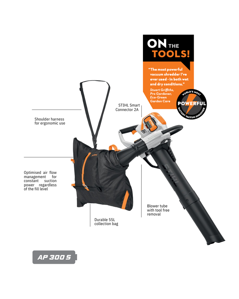 Its quiet operation means that you can use the STIHL SHA 140 battery-powered vacuum shredder to carry out your cleaning work without hearing protection. Using the variable gear lever, the suction power can be steplessly adjusted and adapted to the respective requirement. For maximum suction power, the SHA 140 includes a boost function, which you can conveniently activate using the gear lever. The metal shredder blades ensure effective shredding of the vacuumed material, which is then transported directly into the 55-litre collection bag. The bag can be removed without tools for emptying, and is easily opened and closed again thanks to robust, durable metal buckles. Another advantage of the SHA 140 is the STIHL Air Flow Management feature, which offers consistently high suction power irrespective of the fill level and degree of contamination of the 55-litre collection bag. In addition, the intelligent design of the STIHL SHA 140 means the vacuum shredder can be opened without tools, for cleaning while the suction tube rests on the floor.